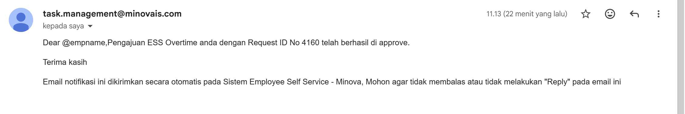 Ketika Approve dan email masuk ke requester, taskID: mail_success di bagian Dear @empname belum terdefined data nya, seperti contoh pada gambar ini;