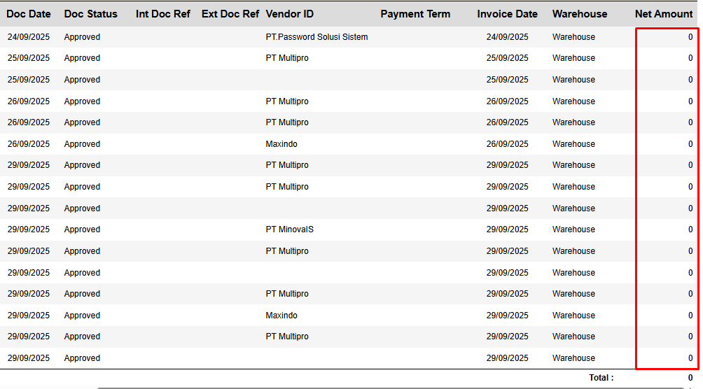 Sama yg kolom Net Amount ini gua lihat masih 0 semua (foto diattach). Tolong dibuat mengambil dari field NetAmount di tabel PTRPURCHITEM ya.