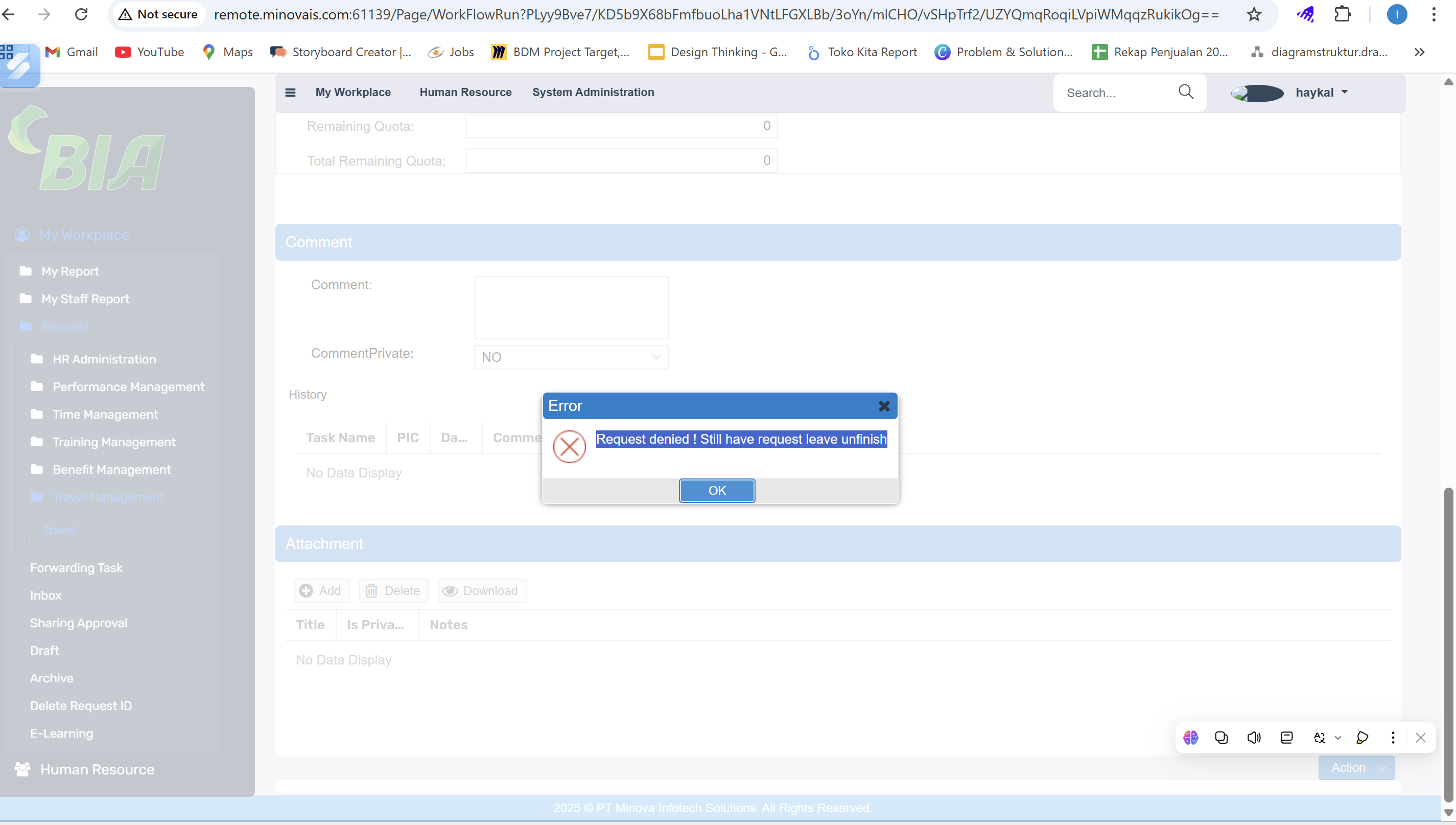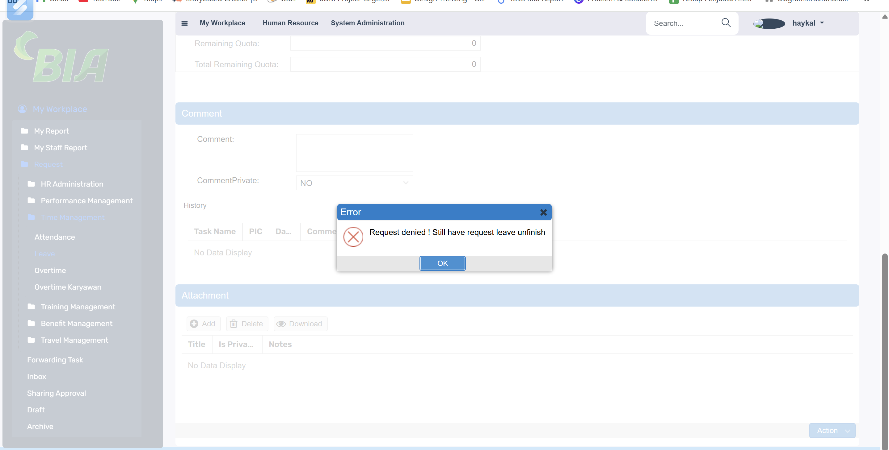 Oke mas sudah muncul validasi nya jika ada yg masih unfinish di Leave. Terima kasih