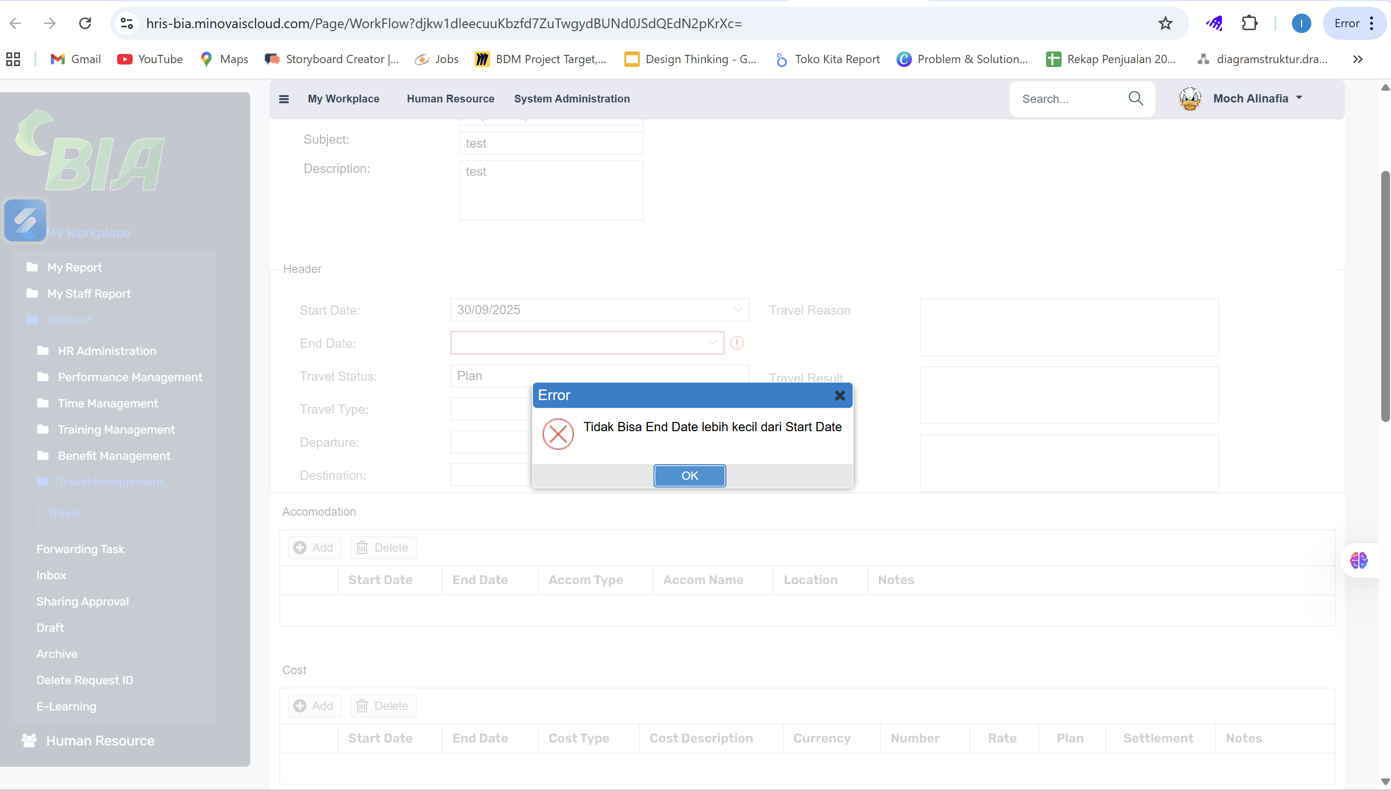 ESS Travel - Validasi End Date tidak boleh lebih kecil dari Start Date