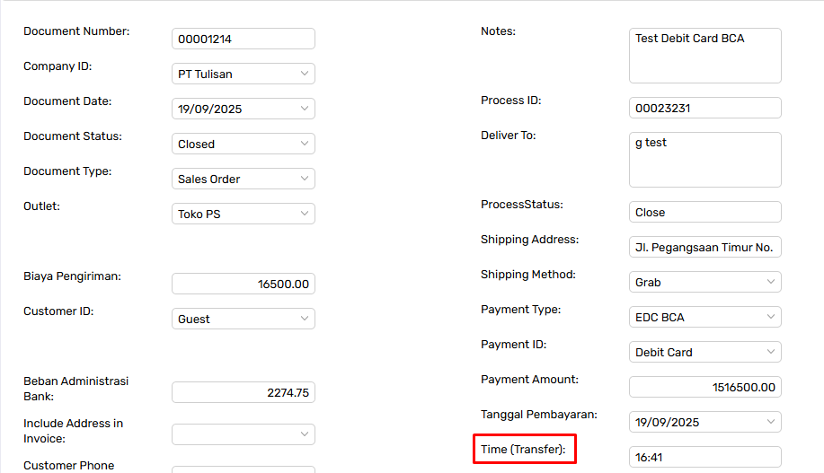 Tadi gua coba Checkout pake EDC BCA Debit Card. Yg mana kalau di pop up itu tidak ada untk mengisikan jam. Tapi kalau gua lihat di dokumen SO nya itu field Time (Transfer) terisi seperti di foto yang gua attach. Harusnya itu gak terisi karena itu gak autorecorded dan user mesti input.
