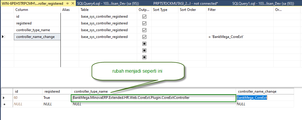 3. Update table base_sys_controller_registered - controller_name_change : BankMega_CoreExt, menjadi seperti gmb dibawah ini :