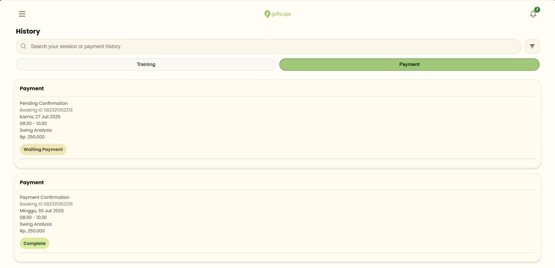 • Detail sesi (SessionName, StartTime, EndTime, Price, Coach).