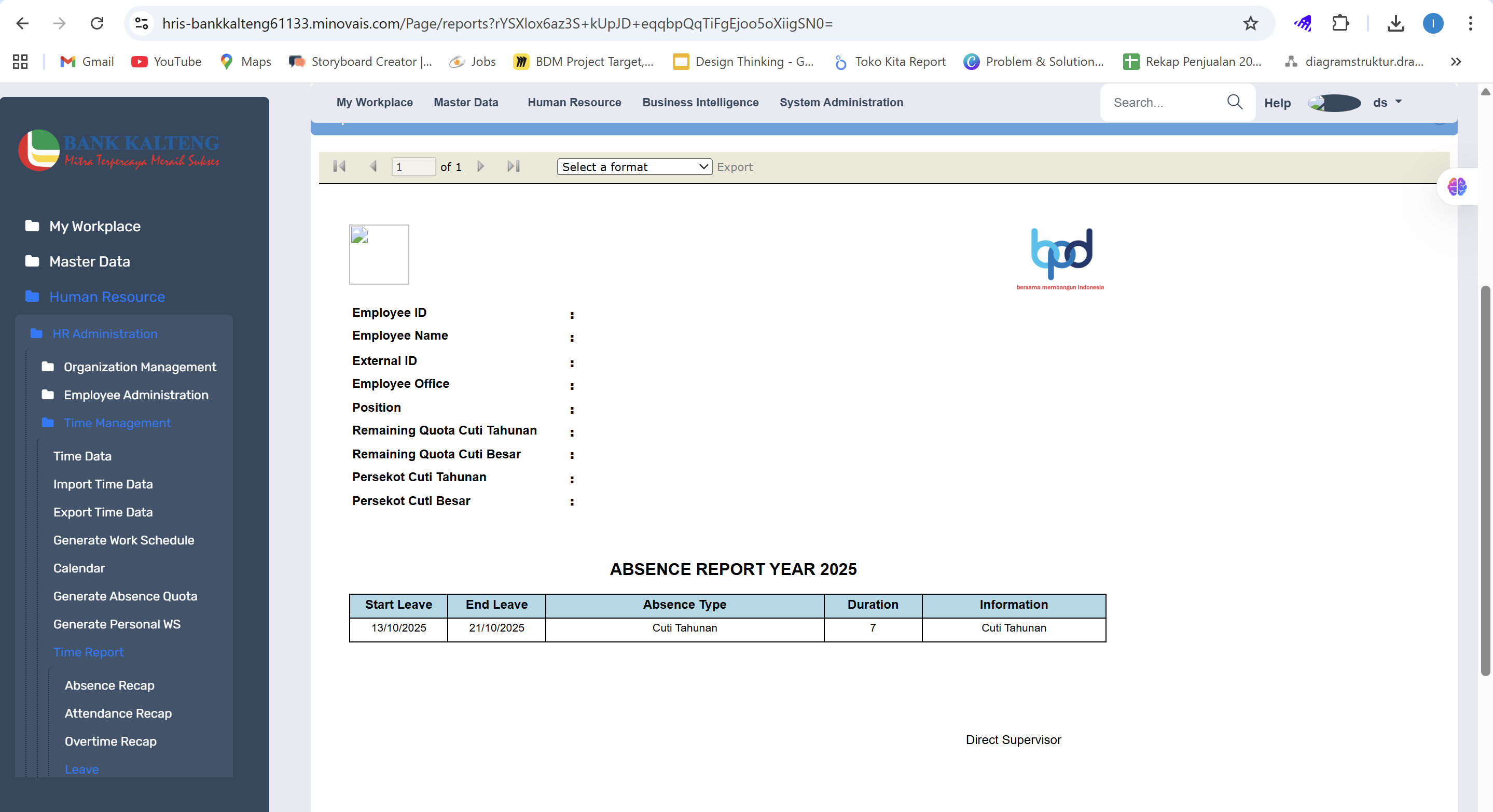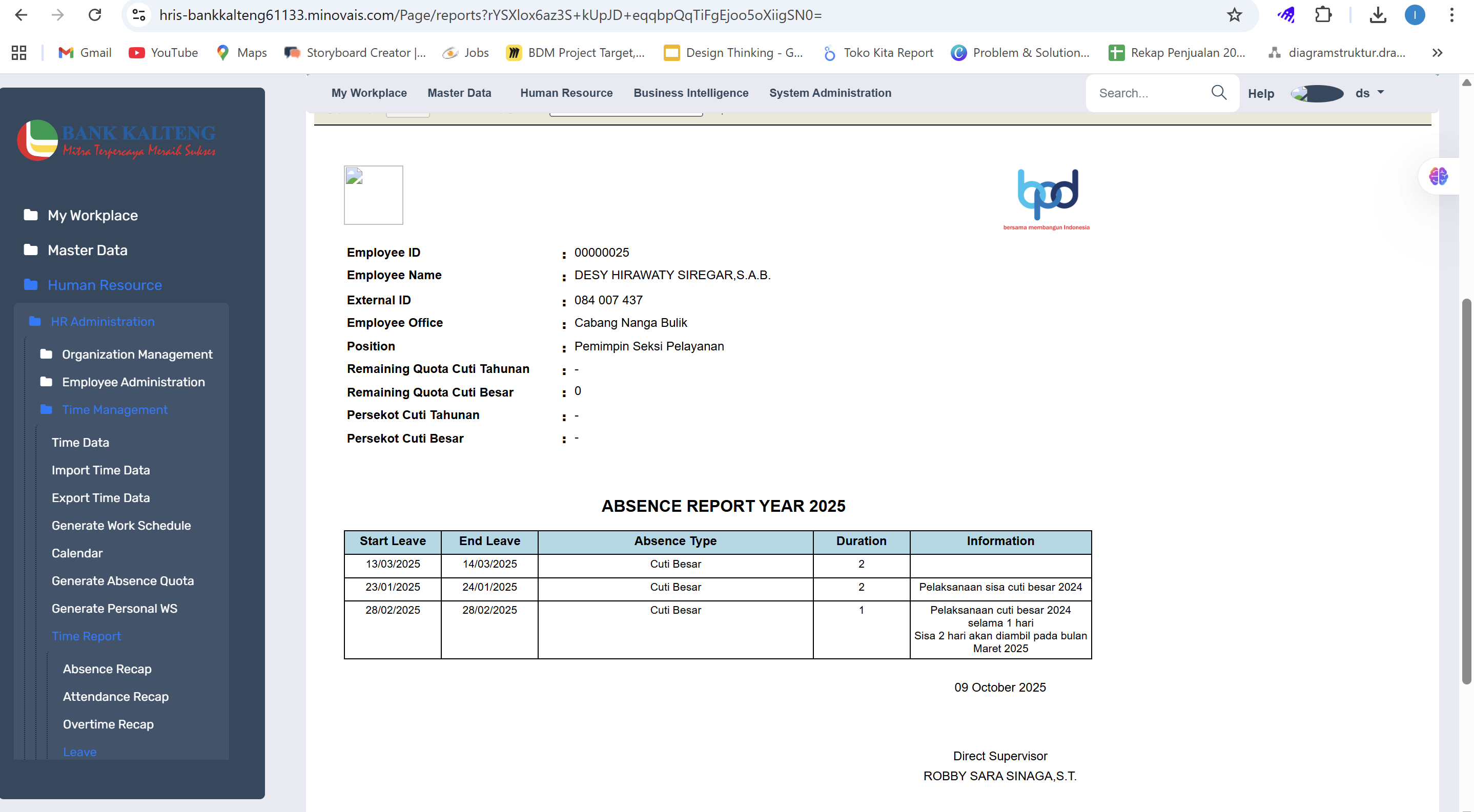 Mohon bantuannya, untuk cek report Leave. Menu nya di Time Management -> Time Report -> Leave.