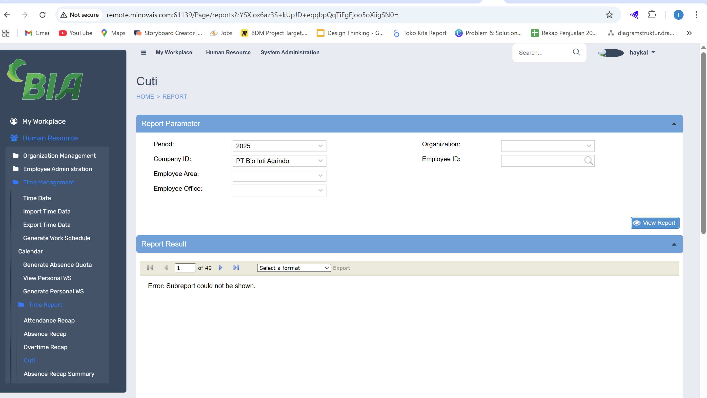 Mohon bantuannya, untuk perbaiki report Cuti di menu Time Management -> Time Report -> Cuti. Karena ada error tampilannya seperti ini: