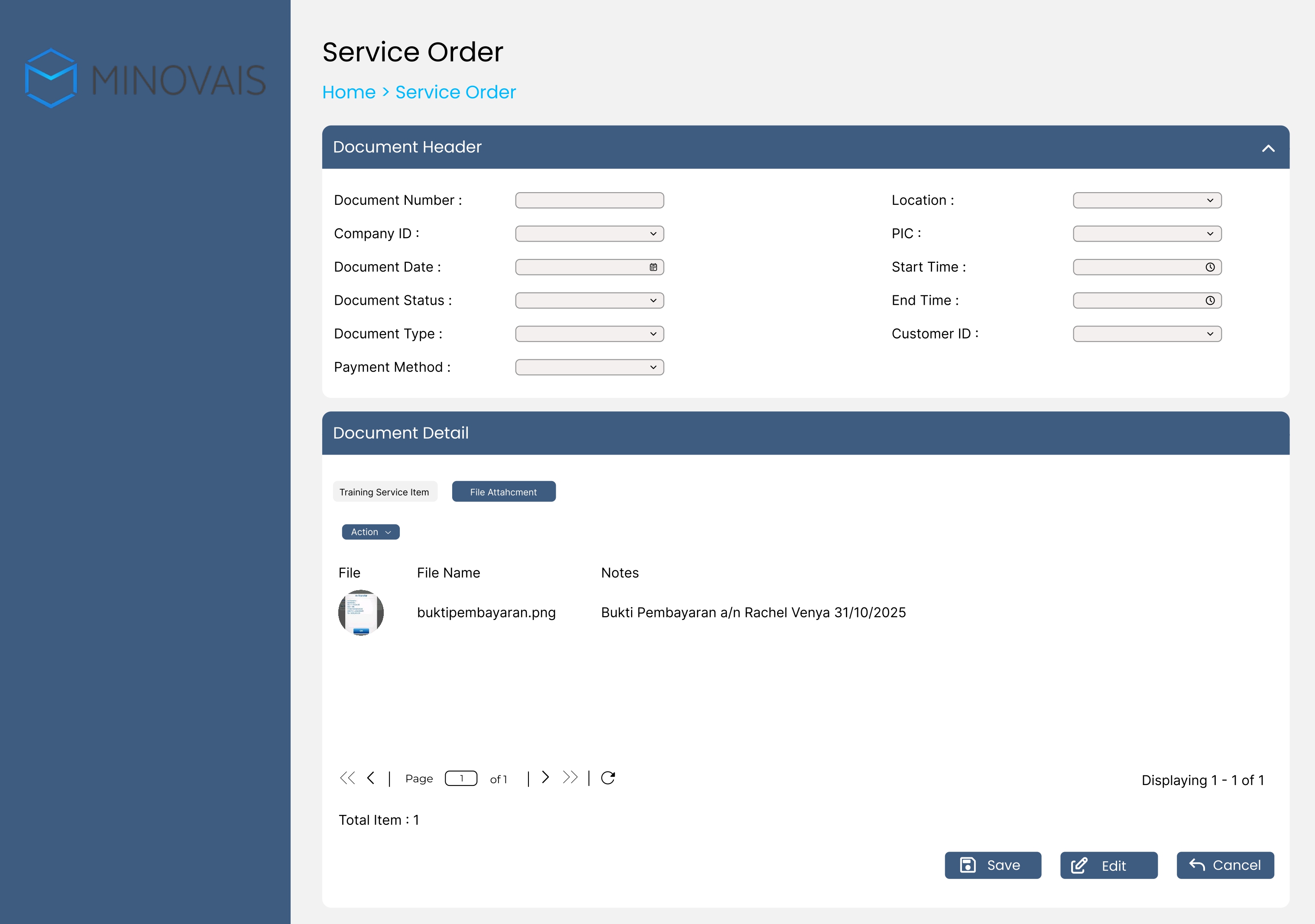 Mohon bantuannya untuk implementasi fitur pop-up preview untuk melihat bukti pembayaran (image attachment) pada halaman Service Order. Ketika user meng-klik foto/file bukti pembayaran di tabel attachment, sistem akan menampilkan pop-up preview dengan tombol Close (X) dan tombol Download.