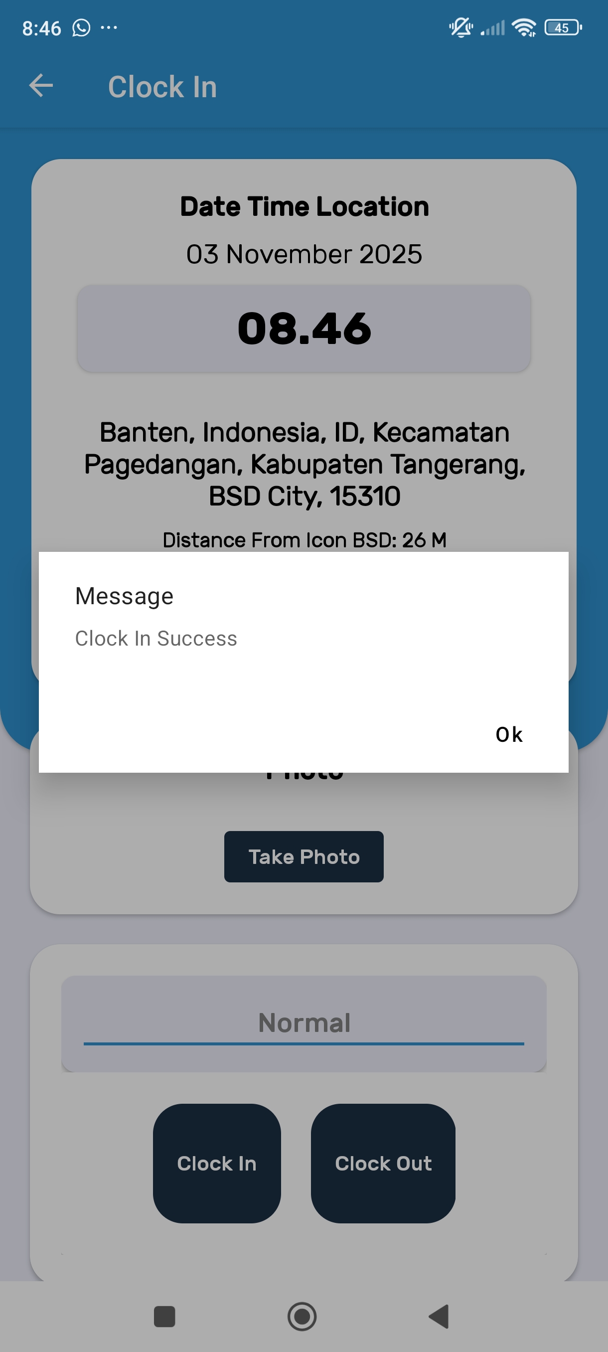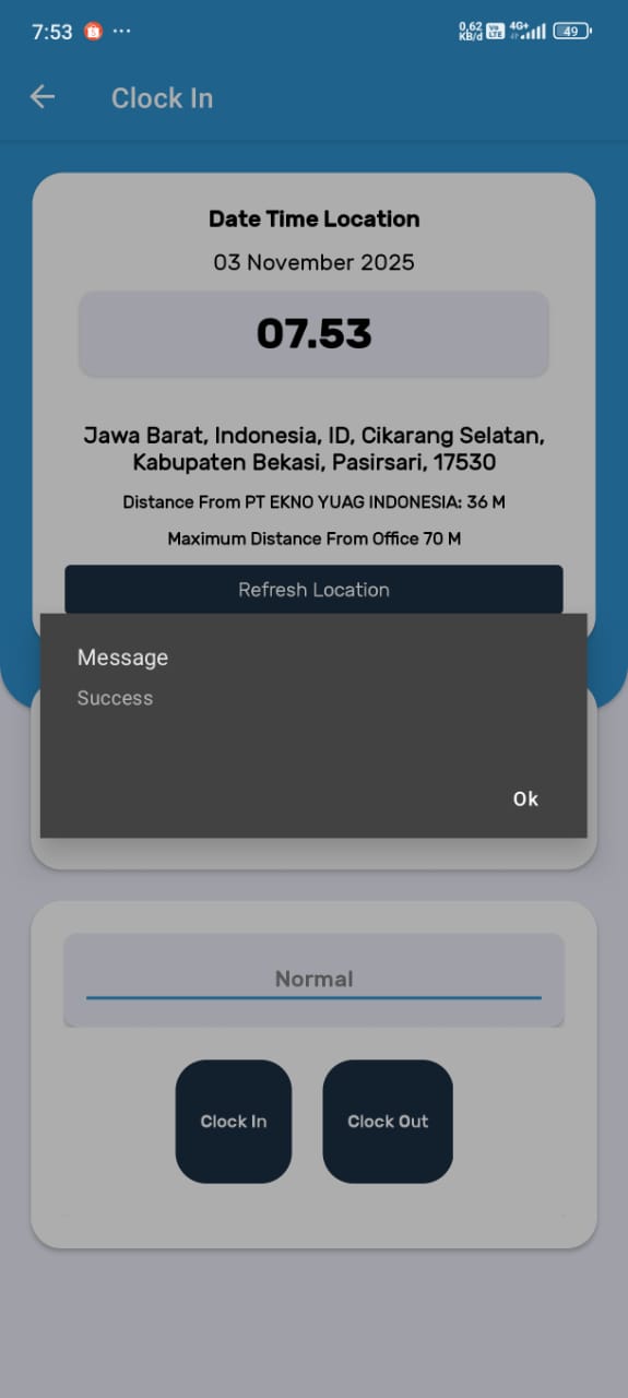 Setahu saya, seharusnya yang muncul adalah 'Clock In Success'. Jika memungkinkan, mohon agar dibuat message yang berbeda apabila terjadi error atau data tidak berhasil ter-post ke MD pada kondisi tersebut ya.