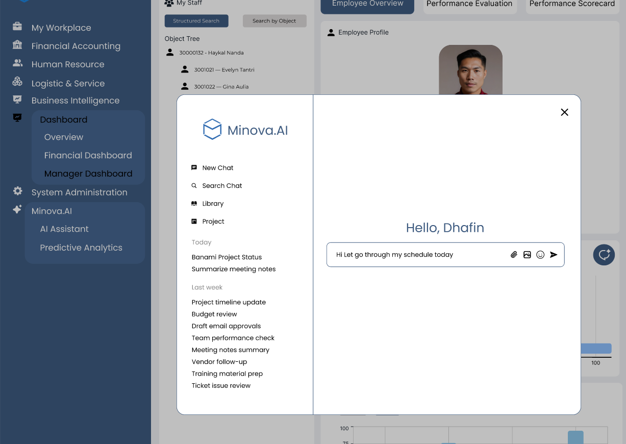 Mohon bantuannya untuk Implementasi popup Minova AI Assistant yang muncul sebagai panel mengambang (floating modal) di atas halaman utama sistem. Popup ini memungkinkan user untuk berinteraksi dengan AI, mengakses riwayat chat, project, library, dan menjalankan perintah cepat.