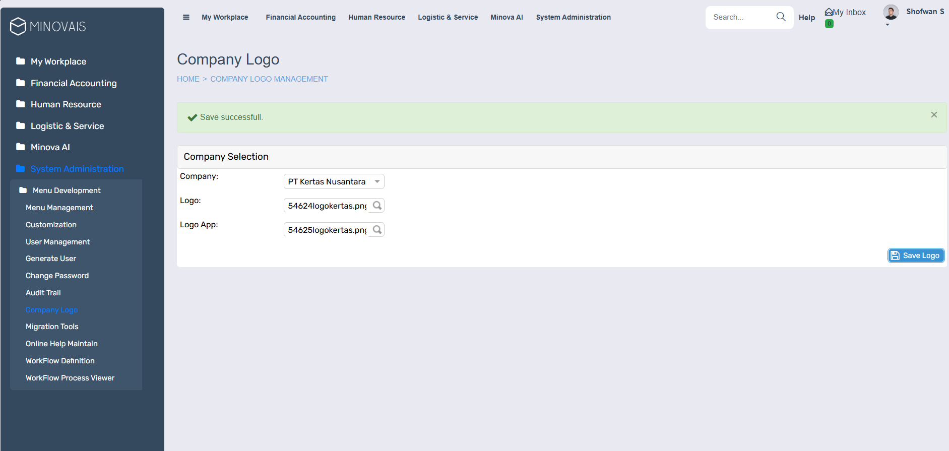 Udh saya coba buat ganti logo di menu Company Logo tapi tetep gabisa, setelah saya tanya mas bin infonya harus di debug sama tim developer.