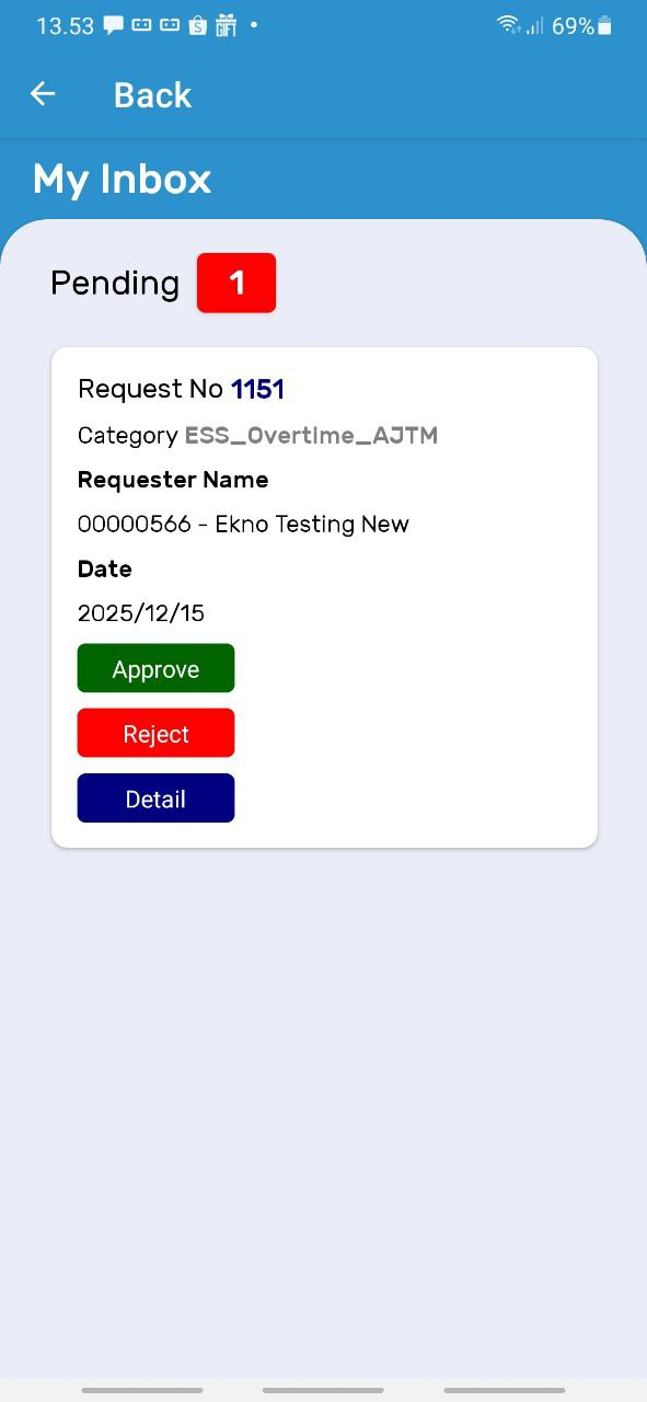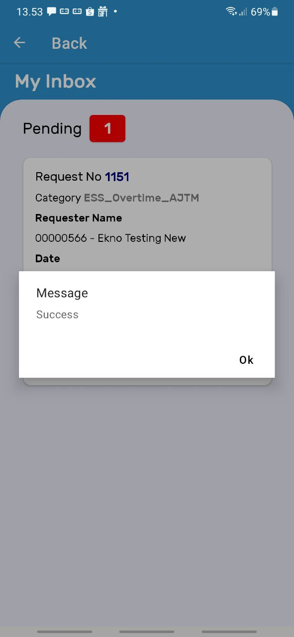 Mohon bantuannya untuk melakukan pengecekan pada pengajuan Overtime, karena terdapat bug di mana setelah saya melakukan Approve melalui mobile dan muncul pesan success, namun request tersebut masih tetap muncul di menu My Inbox pada aplikasi mobile.
