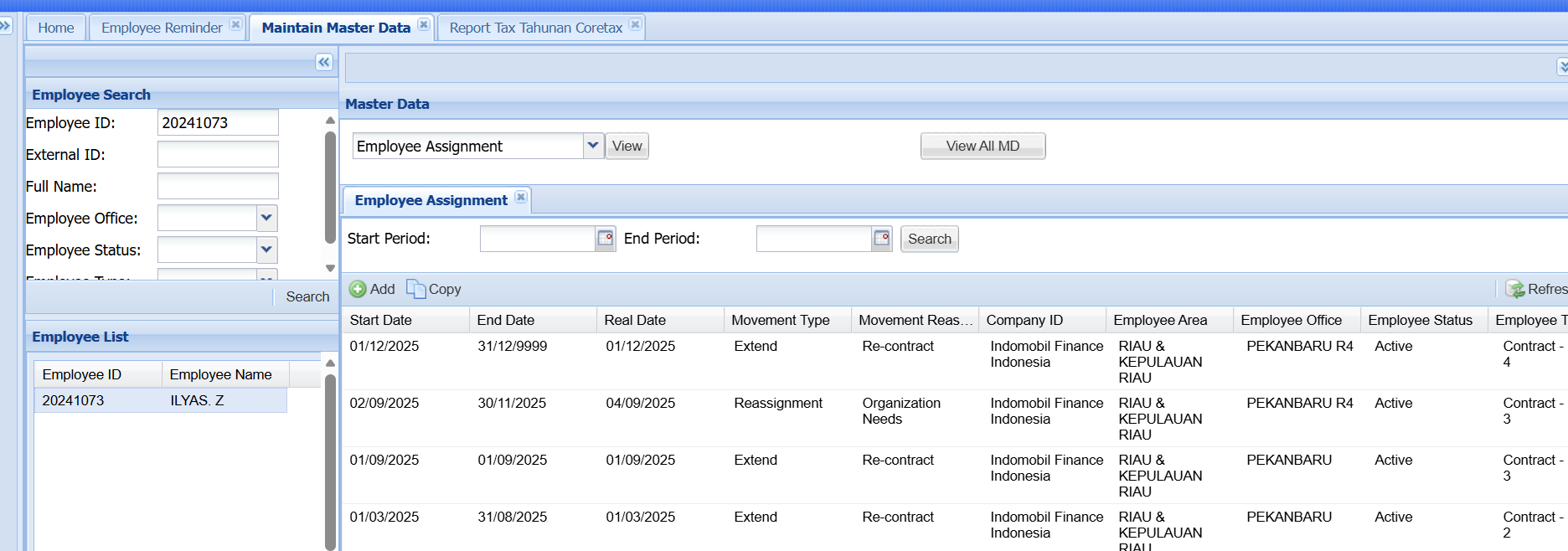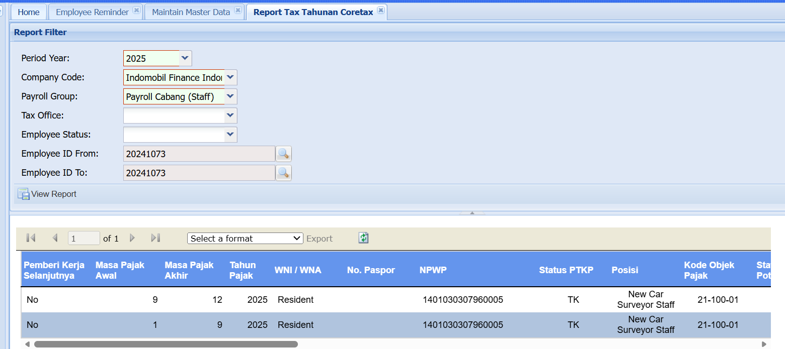 Minta bantuannya untuk dapat memperbaiki Output dari Report Tax Tahunan Cortax, saat ini data karyawan ke Split masa perolehannya karena ybs Mutasi tidak pindah KPP, kondisi yang seharusnya masa perolehan akan ke Split jika mutasinya pindah KPP. untuk contoh kasus bisa mengunakan NIK 20241073 an ILYAS. Z.