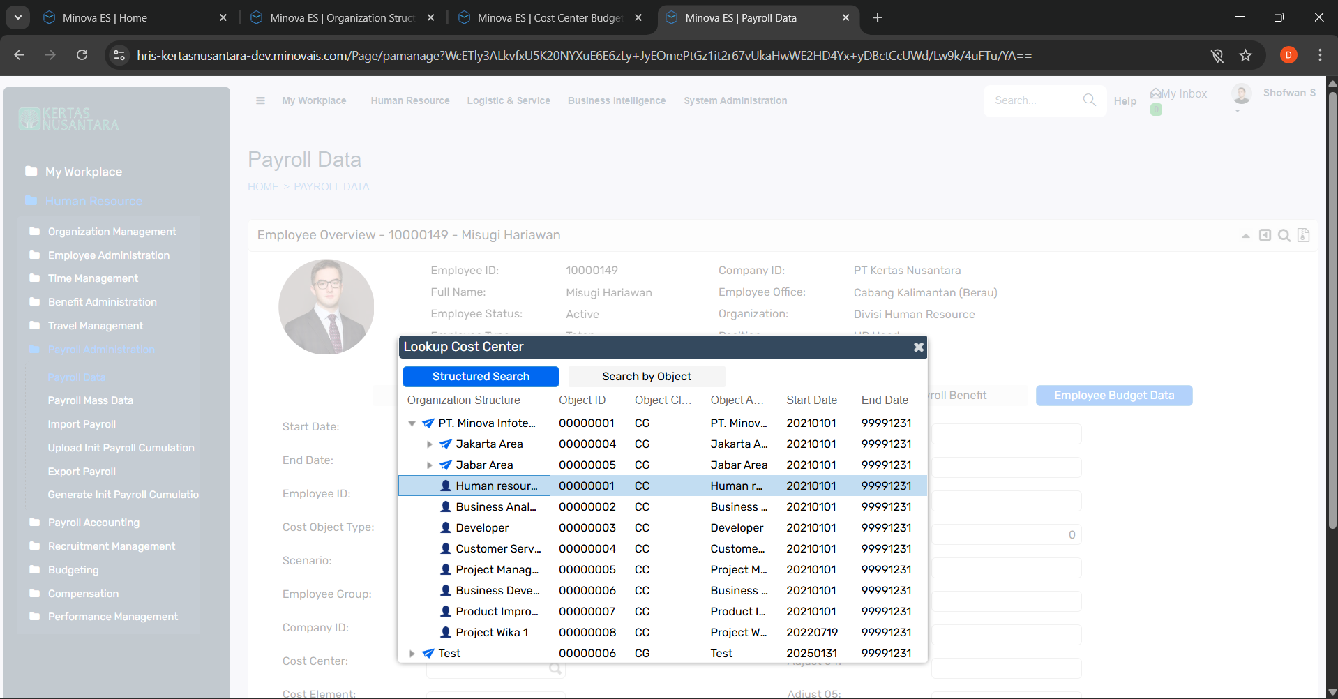 Pada saat memilih karyawan Misugi Hariawan, kemudian melakukan Add Data, field Cost Center tidak dapat dipilih ketika dilakukan klik.