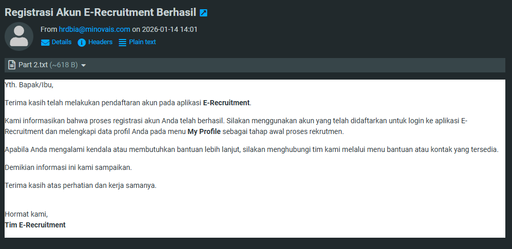 Terima kasih telah melakukan pendaftaran akun pada aplikasi E-Recruitment.