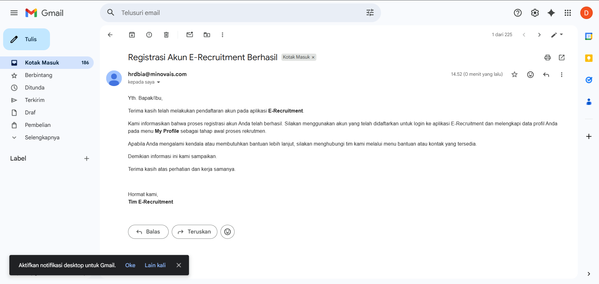 Mohon bantuannya untuk melakukan pengecekan pada port E-Recruitment. Saat saya melakukan pembuatan akun dan menambahkan alamat email sebagai email notifikasi, proses submit berhasil dilakukan. Namun, notifikasi tidak diterima pada email yang telah didaftarkan.