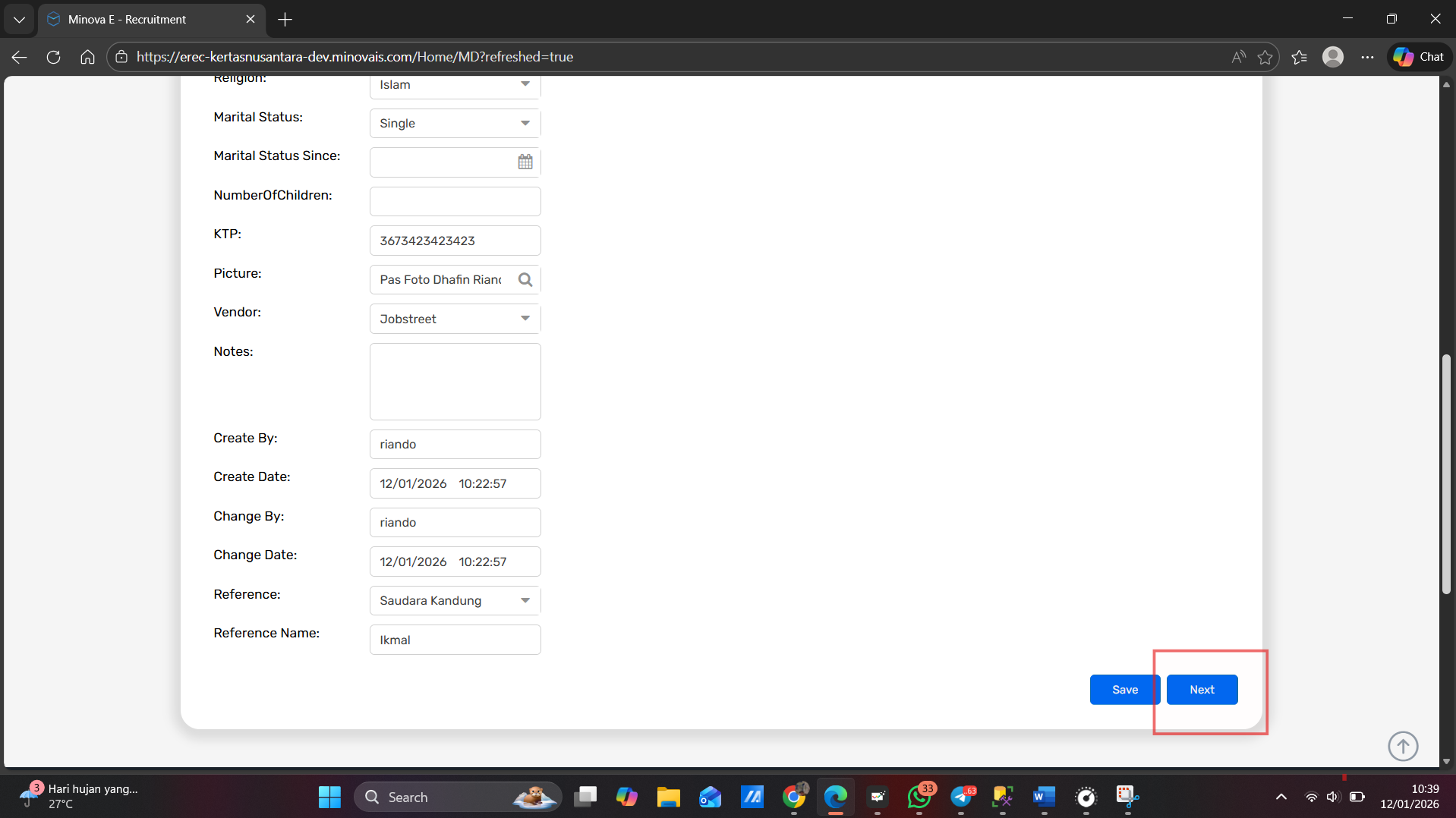 Mohon bantuannya untuk melakukan pengecekan. Saat saya mengisi data pada menu My Profile di aplikasi E-Recruitment, muncul pesan error “Object reference not set to an instance of an object”.