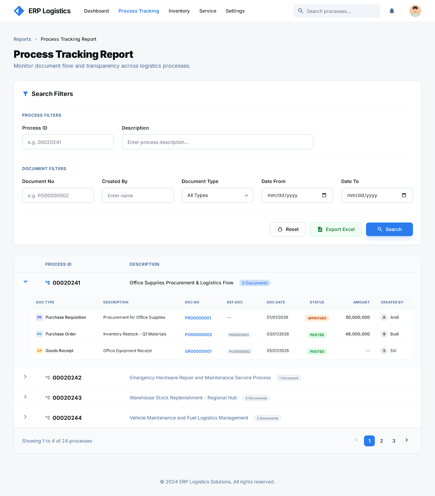 Menu Path: Logistic & Service > Reporting > Process Tracking