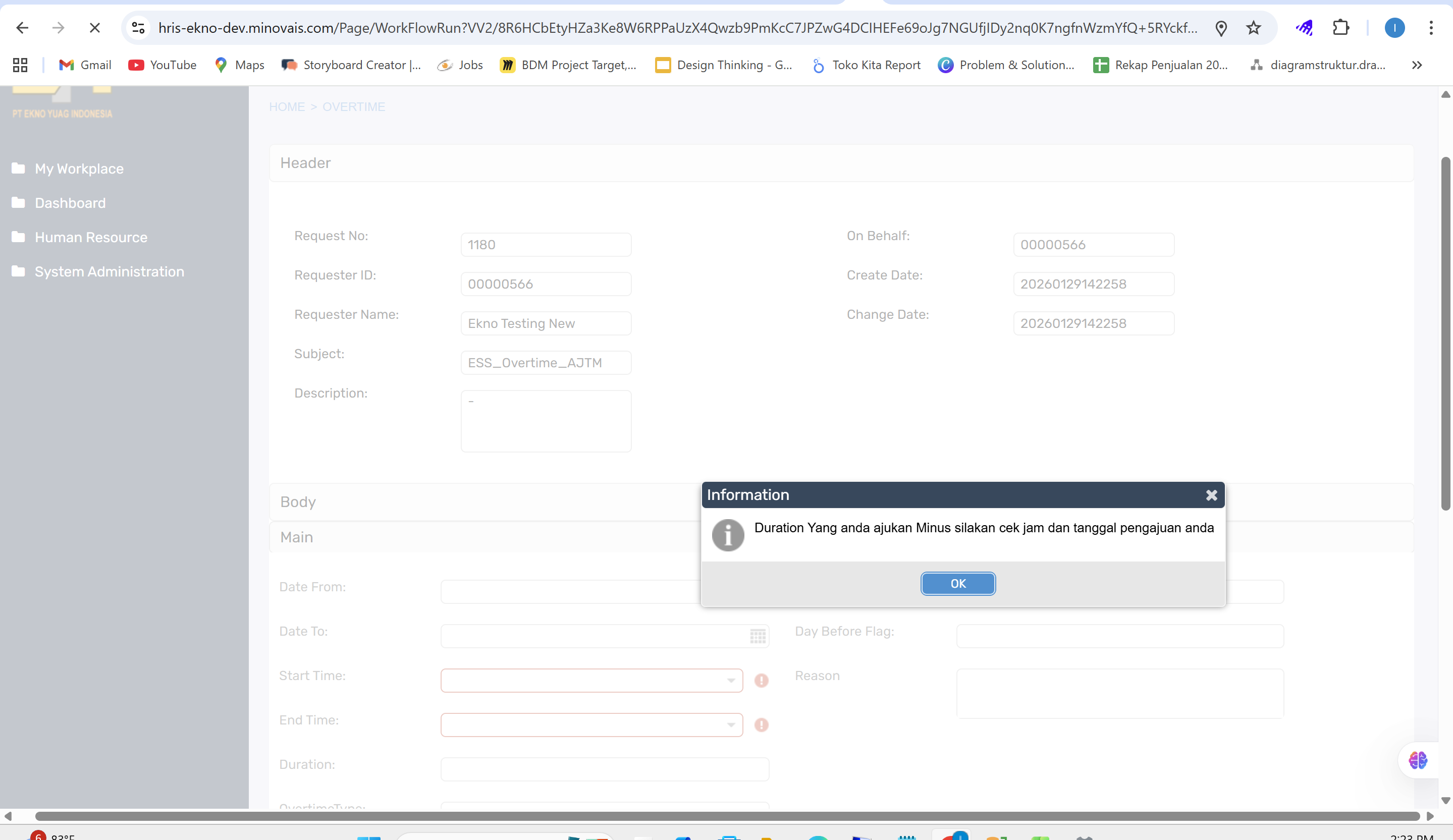 Mohon bantuannya, untuk cek ketika ada pengajuan overtime lintas hari, di mobile sudah bisa, namun ketika ingin approval di website tidak bisa dan muncul validasi seperti ini.