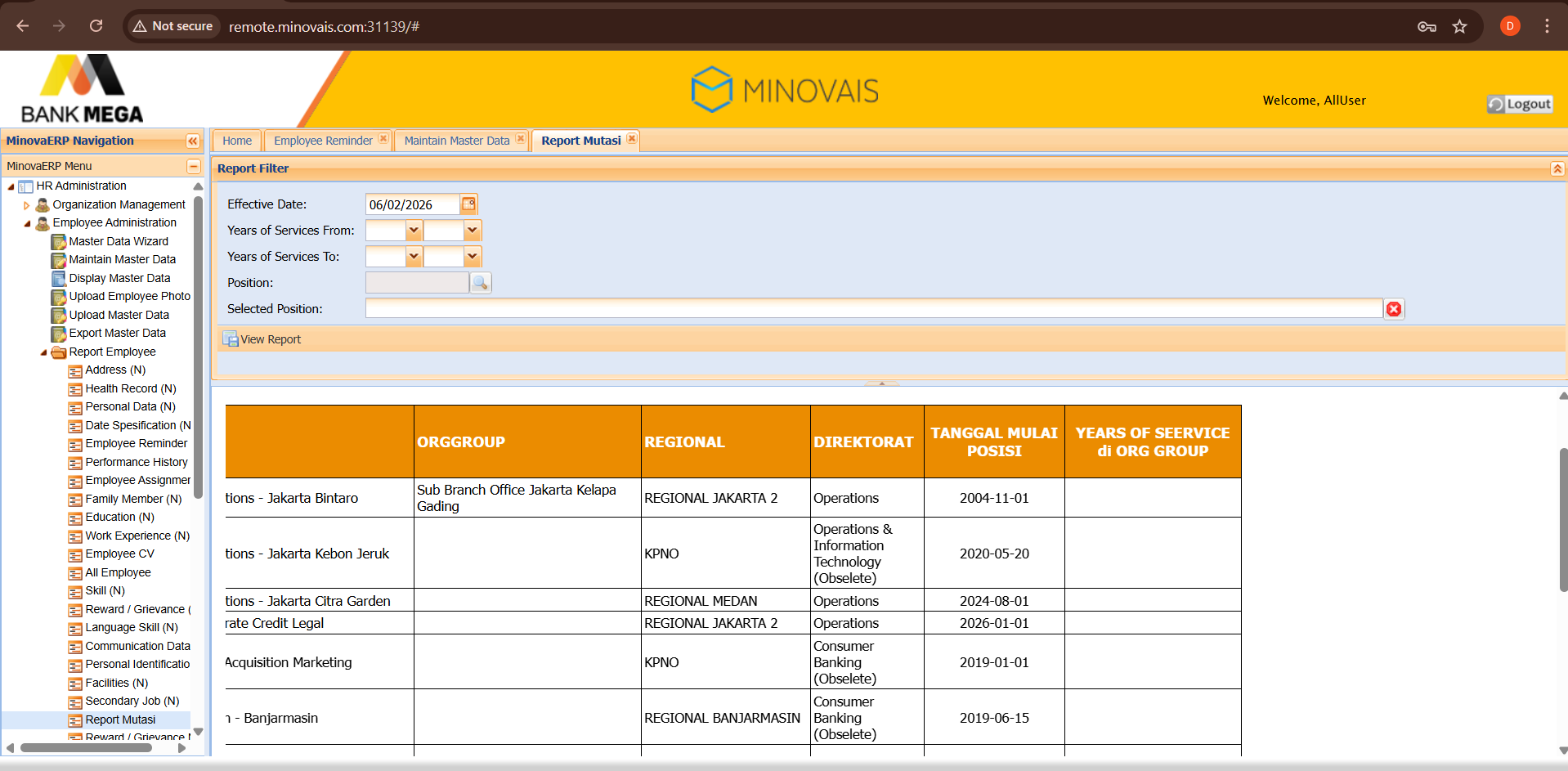 Seharusnya pada report mutasi, kolom Years of Service (Org Group) tidak menganggap perpindahan tersebut sebagai mutasi, karena masih berada dalam Org Group yang sama. Mutasi baru seharusnya tercatat apabila terjadi perpindahan organisasi dengan Org Group yang berbeda.